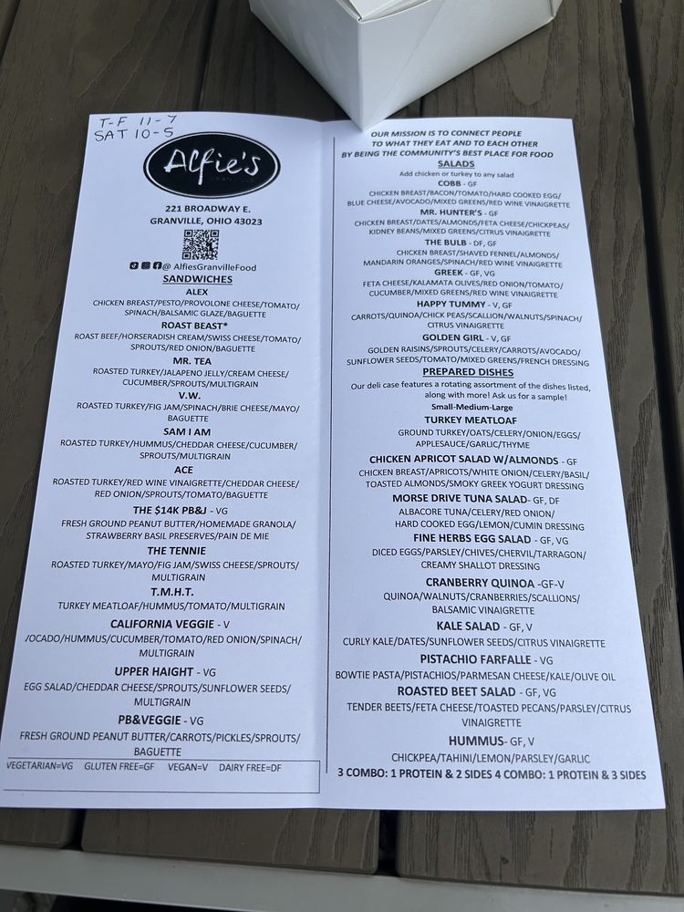 Welcome to Alfie’s Granville, a hidden gem nestled at 221 Broadway E, Granville, OH. This vegetarian haven specializes in American-style sandwiches and wholesome dishes, providing a refreshing alternative to the typical bite. The menu boasts a delightful array of prepared foods, including the Morse Drive Tuna and Roasted Chicken Apricot Salad, showcasing fresh ingredients that nourish both body and spirit.
